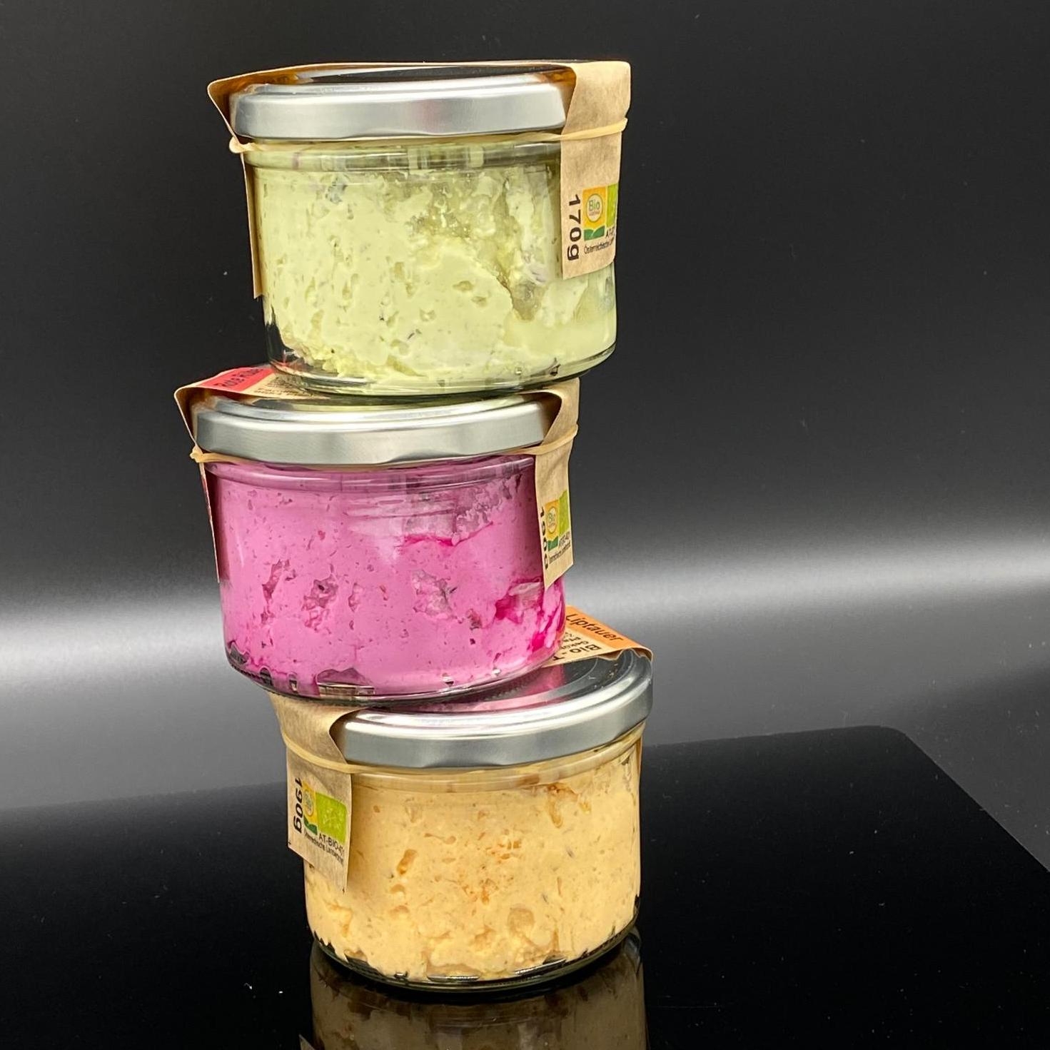 In den bunten Brotaufstrichen „Kürbiskern“, „Liptauer“ und „Rote Rübe“ stecken Bio-Topfen vom Froihof und verfeinernde Zutaten von steirischen Bio-Bauern aus der näheren Umgebung, wie Steirischer Kren, Rote Rüben, Zwiebel, Kürbiskerne und das Steirische Kernöl. In Kleinchargen händisch hergestellt, sind sie für bewußte Genießer eine Bereicherung am Frühstücks- und Jausentisch.